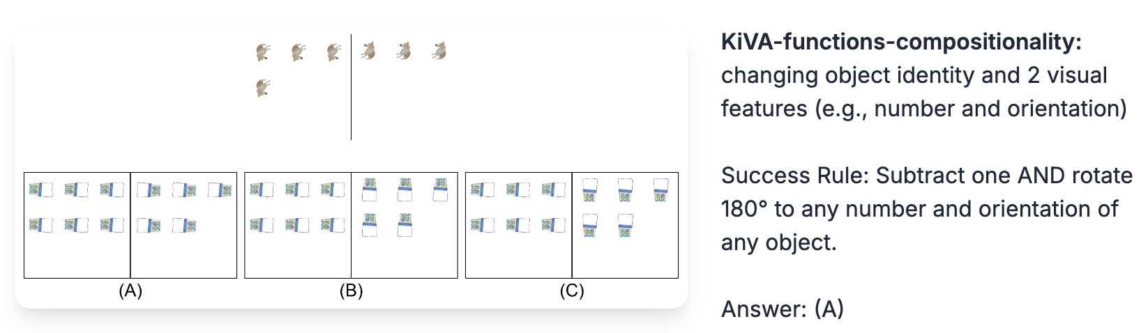 - KiVA-functions-compositionality (difficult): The object identity and two visual features (e.g., orientation, size, or number) change between the example and test