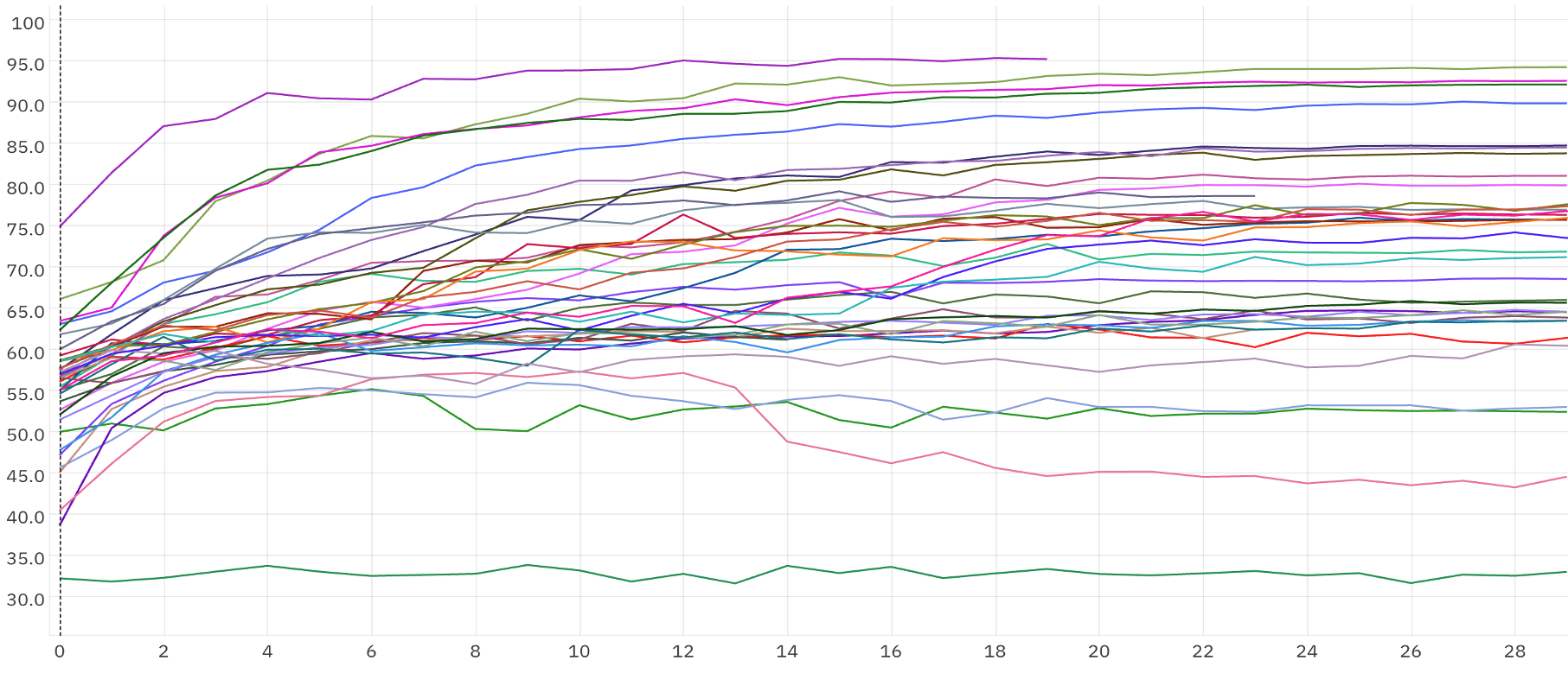 The final configuration was identified after extensive experimentation (152 runs), as illustrated by the sample of training curves below: