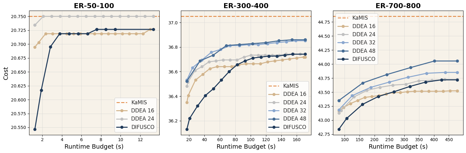 Comparison with DIFUSCO: DDEA consistently outperforms DIFUSCO given the same time budget across all datasets. On ER-50-100, DDEA achieves optimal solutions in just two generations. On larger graphs (ER-300-400 and ER-700-800), DDEA maintains superior performance throughout the considered time budgets.
