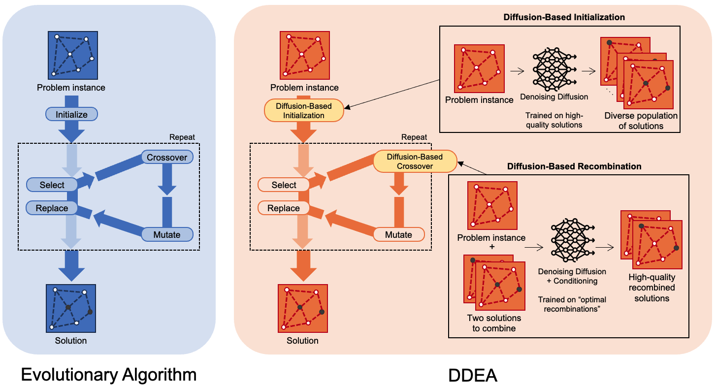This highlights a critical gap: while DDMs excel at generating potentially diverse solutions, they frequently lack the robust, structured exploration mechanisms inherent in classical metaheuristics like evolutionary algorithms (EAs). Conversely, EAs provide a general framework for robust search but can struggle without effective methods to initialize populations with high-quality, diverse individuals or to generate promising offspring through recombination.